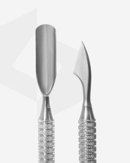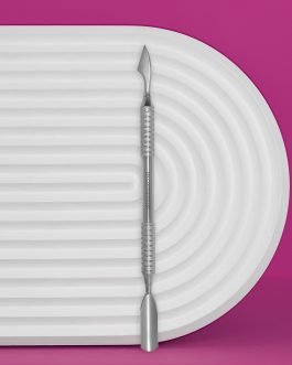 - Zaokrąglony pusher o szerokim kształcie, nóż prostokątny: Narzędzie posiada zaokrąglony pusher o szerokim kształcie oraz nóż prostokątny, co umożliwia pielęgnację paznokci o różnych szerokościach płyt paznokciowych oraz precyzyjne usuwanie skórek.